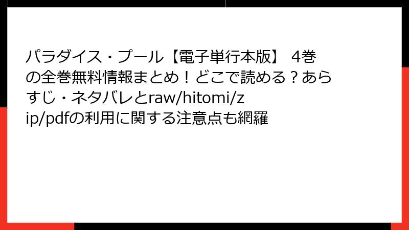総括すると、電子書籍の選択肢は豊富で、クーポンを駆使すれば1冊数百円でゲット可能。『パラダイス・プール 4巻』の大家さんとのドキドキシーンを、合法的に安全に味わいましょう。次巻への布石も満載なので、シリーズ勢揃いのサービスを選んで一気読みを!