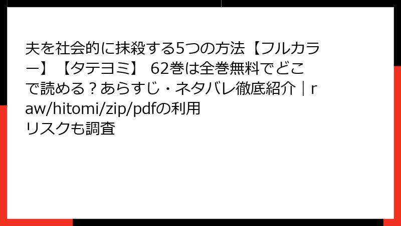 復讐の連鎖が止まらない人気ウェブ漫画『夫を社会的に抹殺する5つの方法【フルカラー】【タテヨミ】』。DVやモラハラに苦しむ女性たちが、謎の仮面の男の指示で夫を社会的に追い詰めるサスペンスストーリーです。全62巻(2025年11月時点)で連載中、特に62巻はSeason3のクライマックスとして、読者の間で話題沸騰。この記事では、全シーズンのネタバレを徹底解説。被害者の心理、加害者の末路、5つの方法の具体的手法まで、ネタバレ満載でお届けします。未読の方はご注意を!