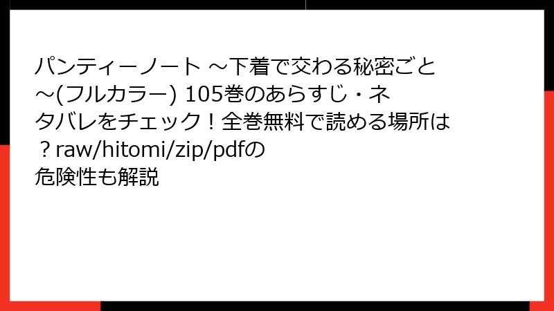 こんにちは、皆さん! 今日のブログでは、人気エロティック漫画『パンティーノート ~下着で交わる秘密ごと~』を、raw、hitomi、zip、pdf、漫画バンクなどの海賊版サイトで読むことのリスクについて、詳しく掘り下げます。この作品は魅力的なストーリーとビジュアルでファンを魅了していますが、海賊版サイトを利用するのは一見便利そうに見えて、実は深刻な問題を抱えています。無料で手軽にアクセスできる誘惑は強いですが、法的・セキュリティ面での危険が潜んでいます。以下で具体的に解説しますので、参考にしてください。