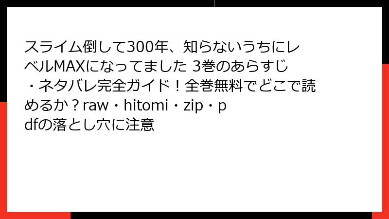 人気の異世界スローライフ漫画『スライム倒して300年、知らないうちにレベルMAXになってました』を、raw/hitomi/zip/pdf/漫画バンクなどの海賊版サイトで読もうと考えている人もいるかもしれません。しかし、そんな選択にはさまざまなリスクが伴います。この記事では、海賊版サイトを利用する際の潜在的な問題点を詳しく掘り下げ、なぜ正規ルートをおすすめするのかを解説します。法的側面からセキュリティ、倫理的な観点まで、読み応えのある内容でお届けします。海賊版は一見便利ですが、後悔する前に知っておくべき事実です。
