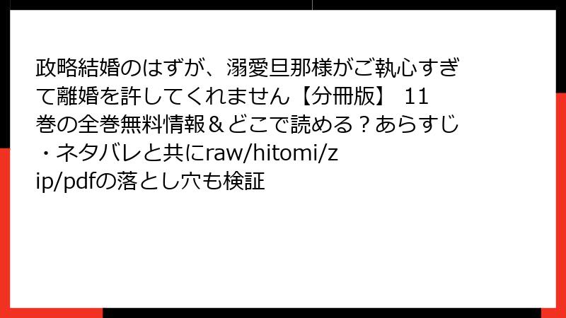 こんにちは、漫画好きの皆さん! 今日は、甘々溺愛ラブストーリーの代表作ともいえる『政略結婚のはずが、溺愛旦那様がご執心すぎて離婚を許してくれません【分冊版】』の11巻について、徹底的に掘り下げてみます。この作品は、政略結婚から始まる夫婦の関係が、徐々に本物の愛情に変わっていく過程が魅力満載。分冊版の11巻(主に11話に相当)は、特に二人の関係が一気に深まるターニングポイント! ネタバレ満載で詳しくお届けするので、未読の方はご注意を。読み応えたっぷりに、ストーリーの流れや見どころをハッキリまとめました。