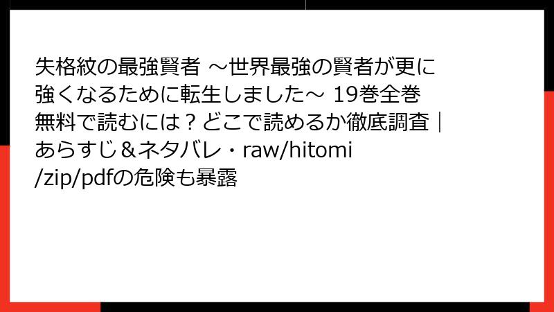 こんにちは、漫画ファン向けのブログへようこそ! 今日は、人気ファンタジー漫画『失格紋の最強賢者 ~世界最強の賢者が更に強くなるために転生しました~』を、raw、hitomi、zip、pdf、漫画バンクなどの海賊版サイトで読むことのリスクについて、詳しく掘り下げます。この作品は転生無双の爽快ストーリーが魅力ですが、海賊版サイトを利用するのは一見無料で便利に見えて、実は深刻な問題を抱えています。法的トラブルからセキュリティの脅威まで、さまざまな角度から解説します。決して軽視せず、正規ルートをおすすめします。それでは、早速本題へ!