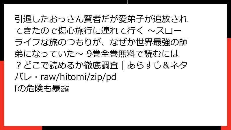 こんにちは、マンガ愛好家のブロガーです。今日は、人気ファンタジーコミック『引退したおっさん賢者だが愛弟子が追放されてきたので傷心旅行に連れて行く ~スローライフな旅のつもりが、なぜか世界最強の師弟になっていた~』を、raw、hitomi、zip、pdf、漫画バンクといった海賊版サイトで読むことのリスクについて、詳しく掘り下げます。この作品はスローライフと冒険の魅力満載ですが、海賊版を利用するのは絶対に避けましょう。2025年現在、海賊版サイトの利用はますます厳しく取り締まられており、さまざまな危険が潜んでいます。以下で、法的・セキュリティ・経済的・その他の観点から、読み応えのある形で解説します。海賊版の誘惑に負けず、正規ルートで楽しむことをおすすめします。