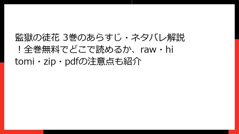 こんにちは、漫画ファンで著作権問題にも詳しいブロガーです。今日は、話題の漫画『監獄の徒花』を、raw、hitomi、zip、pdf、漫画バンクなどの海賊版サイトで読むことのリスクについて、徹底的に掘り下げます。これらのサイトは一見便利に見えますが、利用者が直面する危険は想像以上。法的トラブルからセキュリティ脅威まで、さまざまな側面から解説します。決して推奨するものではなく、警告としてお読みください。知識として知っておくことで、正しい楽しみ方を選択しましょう。