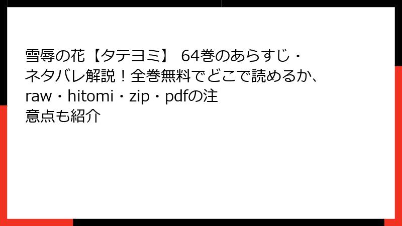 こんにちは、漫画ファン管理人です! 人気BL作品『雪辱の花【タテヨミ】』を、raw/hitomi/zip/pdf/漫画バンクなどの海賊版サイトで無料で読もうと考えている方、ちょっと待って! 確かに魅力的に見えますが、そこには深刻なリスクが潜んでいます。今回は、そんな海賊版サイト利用の危険性を詳しく解説。法的問題からセキュリティの脅威、業界への悪影響まで、読み応え満載でお届けします。海賊版は一時的な楽しみを提供するかもですが、長期的に見て損失が大きいんですよ。知って正しい選択をしましょう!