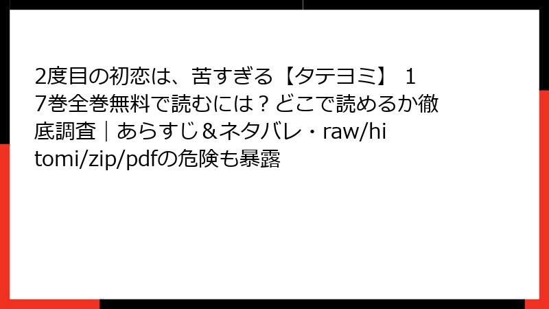 の見出しタグから始めて、ブログ記事形式で出力して。複数の タグを使用して、読み応えがあるように。HTMLで出力。 や などの箇条書きのHTMLタグや、tableタグも使用してOK。ただし、リンクやURLは、絶対に、挿入しない。 この漫画・コミックを、raw/hitomi/zip/pdf/漫画バンクなどの海賊版サイトで読むことのリスクを、詳しく。単一の の見出しタグから始めて、ブログ記事形式で出力して。複数の タグを使用して、読み応えがあるように。HTMLで出力。 や などの箇条書きのHTMLタグや、tableタグも使用してOK。ただし、リンクやURLは、絶対に、挿入しない。 この漫画・コミックの、レビュー・口コミ・評判について、詳しく。単一の の見出しタグから始めて、ブログ記事形式で出力して。複数の タグを使用して、読み応えがあるように。HTMLで出力。 や などの箇条書きのHTMLタグや、tableタグも使用してOK。ただし、リンクやURLは、絶対に、挿入しない。 2度目の初恋は、苦すぎる【タテヨミ】 17巻 レビュー・口コミ・評判大特集:甘く苦い再会が織りなす胸キュン評価