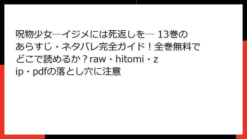 こんにちは、マンガファン歴20年のブログ主です。今日は、人気ホラー復讐マンガ『呪物少女─イジメには死返しを─』を、raw、hitomi、zip、pdf、漫画バンクなどの海賊版サイトで読むことのリスクについて、徹底的に掘り下げます。この作品は、イジメの闇と呪いの恐怖が融合したスリリングなストーリーですが、無料で読みたいという誘惑に負けて海賊版に手を出してしまうと、後悔する羽目になるかも。法的問題からセキュリティの脅威まで、リアルな危険性をネタバレなしで解説。安全に楽しむための警告としてお読みください。海賊版はクリエイターの努力を踏みにじる行為ですよ!