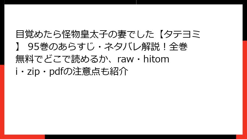 こんにちは、漫画好きのブロガーです! 今日は、人気ファンタジー転生漫画『目覚めたら怪物皇太子の妻でした【タテヨミ】』の95巻(95話)について、詳しく深掘りしていきたいと思います。この作品は、現代女性が小説の世界に転生し、呪われた皇太子の運命を変えていく心温まるラブストーリー。タテヨミ形式のフルカラーで読みやすく、毎回ドキドキの展開が魅力です。ネタバレ満載なので、未読の方はご注意を! 今回は、作品全体の概要から95巻の細かなあらすじ、キャラクターの心理描写まで、読み応えたっぷりにまとめました。さっそく本題へ。