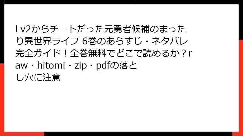 人気の異世界ファンタジー漫画「Lv2からチートだった元勇者候補のまったり異世界ライフ」の第6巻を、raw、hitomi、zip、pdf、漫画バンクなどの海賊版サイトで無料で読もうと考える人もいるかもしれません。しかし、そんな行為には想像以上のリスクが伴います。この記事では、海賊版サイトを利用する危険性を詳しく解説。法的・セキュリティ面から倫理的側面まで、ブログ風に深掘りします。安易な選択が、後悔を生む可能性をしっかり理解しましょう。