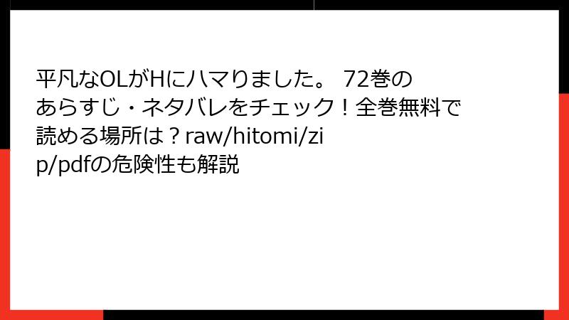 こんにちは、漫画ファン向けのブログを書いている者です。今日は、人気エロティックコミック『平凡なOLがHにハマりました。』を、raw、hitomi、zip、pdf、漫画バンクといった海賊版サイトで読むことのリスクについて、詳しく掘り下げてお話しします。この作品は魅力的なストーリーと大胆な描写でファンを増やしていますが、海賊版サイトを利用するのは一見便利に見えて、実は大きな危険を伴います。法的問題からセキュリティの脅威まで、さまざまな角度から解説します。絶対に正規ルートをおすすめしますが、まずはリスクを理解しましょう。