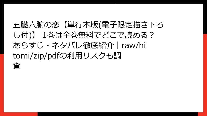 人気のBLコミック『五臓六腑の恋』を無料で楽しみたいという誘惑はわかりますが、海賊版サイト(raw、hitomi、zip、pdf、漫画バンクなど)を利用するのは大きなリスクを伴います。この記事では、そんな海賊版サイトでマンガを読むことのさまざまな危険性を詳しく解説。法的問題からセキュリティの脅威まで、読み応えのある内容でお届けします。海賊版の甘い罠に落ちないよう、しっかり理解しておきましょう。