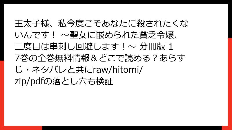 こんにちは、ファンタジー漫画好きのブロガーです! 今日のレビューは、タイムリープ要素満載の人気作『王太子様、私今度こそあなたに殺されたくないんです! ~聖女に嵌められた貧乏令嬢、二度目は串刺し回避します!~』の分冊版17巻。貧乏令嬢リーセルが前世の悲劇を回避しようと奮闘するサクセスストーリーが、ますます熱を帯びてきました。この巻では、リーセルの心の揺らぎと新たな脅威が交錯し、読者の胸を締め付ける展開が満載です。ネタバレ注意で、詳細に掘り下げてお届けします! 単行本の4巻あたりに相当する部分ですが、分冊版ならではの細やかなエピソードが魅力。さっそく深掘りしていきましょう。