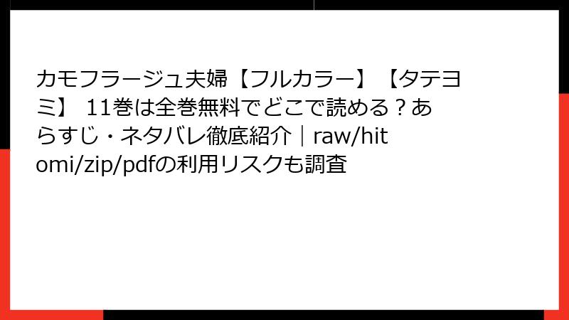 『カモフラージュ夫婦【フルカラー】【タテヨミ】』のような人気漫画を、raw、hitomi、zip、pdf、漫画バンクなどの海賊版サイトで無料で読もうとする人は少なくありません。しかし、これらのサイトを利用することは、単に「無料で楽しめる」以上の大きなリスクを伴います。この記事では、海賊版サイトの利用がもたらす法的、セキュリティ、プライバシー、経済的、倫理的なリスクを詳しく解説します。ブログ形式で読みやすくまとめ、潜在的な危険を理解して、正規の方法で作品を楽しむことをおすすめします。