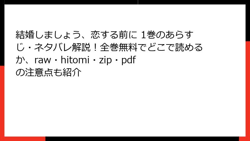 raw、hitomi、zip、pdf、漫画バンクなどの海賊版サイトで「結婚しましょう、恋する前に」1巻を読むのは、法的・セキュリティ・経済的・倫理的な観点から見て、非常に危険です。