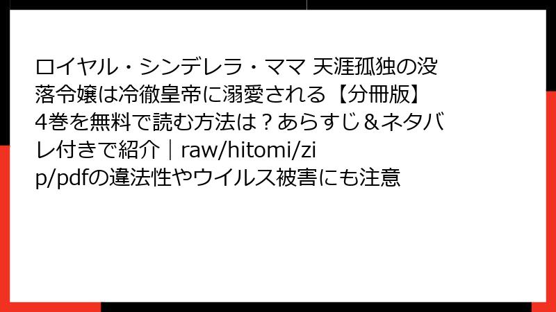 こんにちは、漫画ファン向けのブログへようこそ! 今日は、人気ロマンス漫画「ロイヤル・シンデレラ・ママ 天涯孤独の没落令嬢は冷徹皇帝に溺愛される【分冊版】」の4巻について、海賊版サイト(raw、hitomi、zip、pdf、漫画バンクなど)で読むことのリスクを詳しく掘り下げます。この作品は心温まるストーリーで多くのファンを魅了していますが、無料で手軽に読めそうな違法サイトを利用するのは本当に危険です。法的問題からセキュリティの脅威まで、さまざまな角度から解説していきます。合法的な方法で楽しむことを強くおすすめします。それでは、具体的に見ていきましょう。