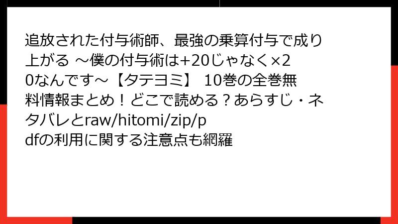 人気の追放系ファンタジーコミック『追放された付与術師、最強の乗算付与で成り上がる ~僕の付与術は+20じゃなく×20なんです~【タテヨミ】』の10巻が登場! この作品は、主人公デズモンドのユニークな乗算付与術が織りなす爽快な成り上がりストーリーが魅力です。10巻では、物語がさらに加速し、主人公の能力が本格的に開花する展開が満載。ネタバレを交えつつ、詳しくあらすじを振り返ってみましょう。タテヨミ形式のダイナミックなアクションシーンが、縦スクロールでより没入感を高めています。