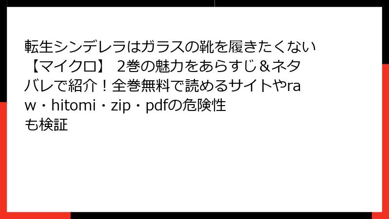 まとめると、海賊版サイトは一時的な無料の代償に、長期的なトラブルを招きます。『転生シンデレラはガラスの靴を履きたくない【マイクロ】 2巻』のような良作を、正しく楽しむのがファンとしての道です。