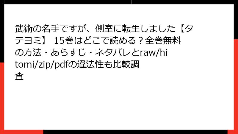 以上のように、raw/hitomi/zip/pdf/漫画バンクなどの海賊版サイトで『武術の名手ですが、側室に転生しました【タテヨミ】』を読むのは、法的・セキュリティ・倫理的・品質面で多大なリスクを伴います。無料の誘惑に負けず、正規の電子書籍サービスやアプリを選べば、安全に高品質な読み体験が得られます。クリエイターを応援しつつ、自分を守るのが真のファン道。皆さんも、賢い選択を心がけましょう! 次回の記事では、正規ルートのオススメを深掘りするかも? コメントお待ちしてます。