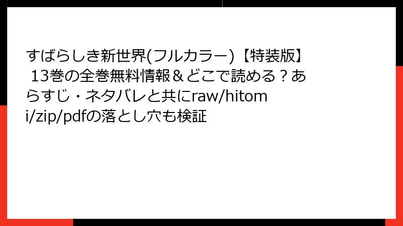 エロティックな社内復讐サスペンスとしてファンを魅了する『すばらしき新世界(フルカラー)【特装版】』の13巻。フルカラーの美しいビジュアルと激動の展開を楽しむなら、電子書籍が便利です。今回は、コミックシーモア、ブックライブ、まんが王国、ebookjapan、Renta!、めちゃコミック、ピッコマ、LINEマンガなどの主要サービスで、この巻が読めるかを徹底調査。配信状況から価格、特典まで詳しく解説します。各サービスで特装版や全年齢版の違いも考慮し、ネタバレなしで読み応えのあるガイドをお届け。あなたの好みに合ったプラットフォームを選んで、田中一郎の逆襲を堪能しましょう!