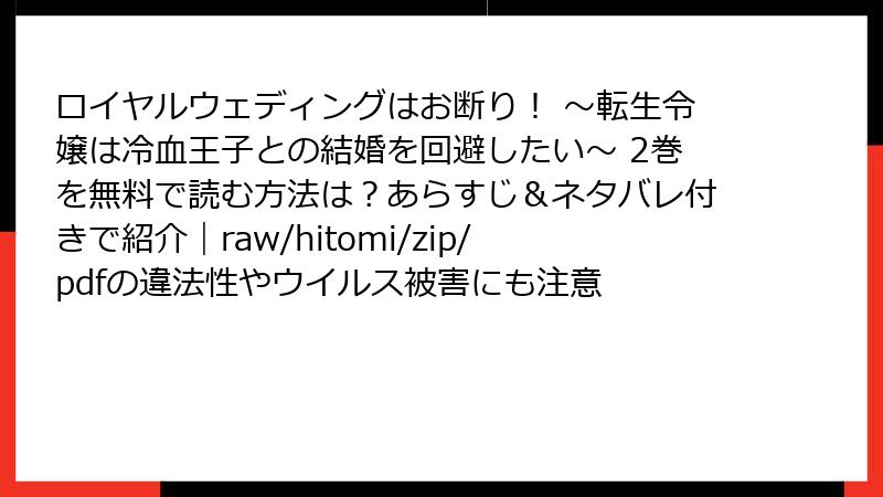 ロイヤルウェディングはお断り! ~転生令嬢は冷血王子との結婚を回避したい~ 2巻を無料で読む方法は?あらすじ&ネタバレ付きで紹介|raw/hitomi/zip/pdfの違法性やウイルス被害にも注意