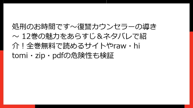 『処刑のお時間です~復讐カウンセラーの導き~』を海賊版で読むのは、法的・セキュリティ・倫理的なリスク満載。無料の罠に落ちず、合法ルートで楽しむのが賢明です。この記事が、あなたのマンガライフをより安全で充実したものにするきっかけになれば幸いです。コメントであなたの体験をシェアしてね!