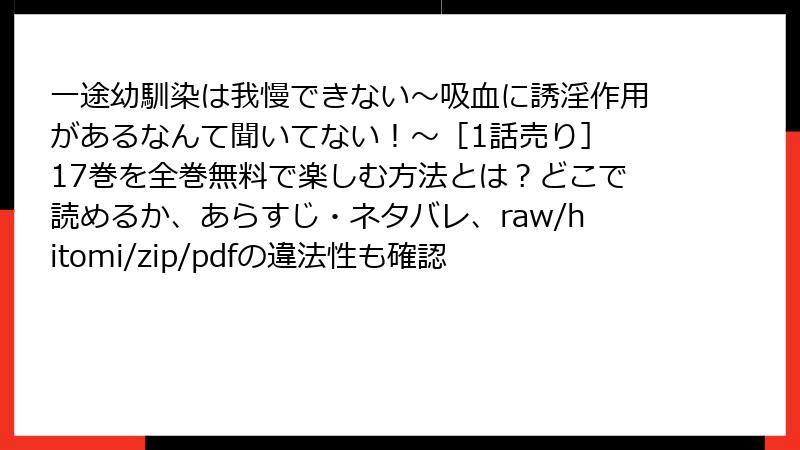 こんにちは、マンガ愛好家のブロガーです! 菅谷チヨ先生の『一途幼馴染は我慢できない~吸血に誘淫作用があるなんて聞いてない!~』は、甘い吸血鬼ラブコメとして大人気ですよね。でも、この作品をraw、hitomi、zip、pdf、漫画バンクなどの海賊版サイトで無料で読もうと考える人もいるかも。そんな行動には、意外と深刻なリスクが潜んでいます。今回は、法的・セキュリティ面から倫理的側面まで、詳しく掘り下げてお伝えします。海賊版の誘惑に負けないよう、しっかり理解しましょう!