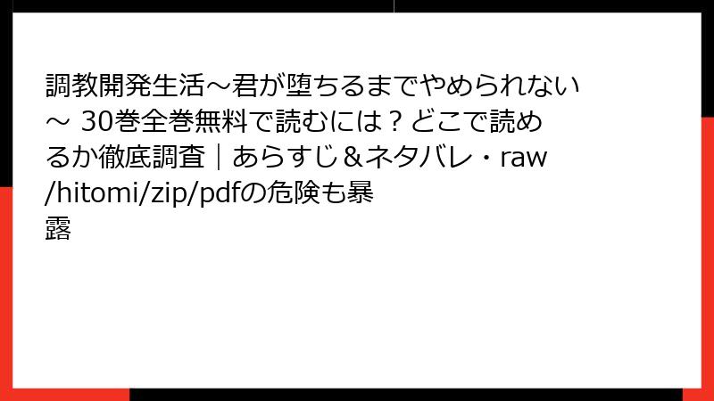 こんにちは、漫画ファン向けの情報ブログです! 今日は、人気BL漫画『調教開発生活~君が堕ちるまでやめられるない~』を、raw、hitomi、zip、pdf、漫画バンクなどの海賊版サイトで読むことのリスクについて、徹底的に掘り下げてお届けします。この作品はハードな調教要素が魅力ですが、正規ルートで楽しむのがベスト。海賊版サイトは一見便利に見えますが、実は多大な危険が潜んでいます。法的問題からセキュリティ面まで、読み応えのある内容で解説しますので、ぜひ最後までお読みください。海賊版の利用は絶対に避けましょう!