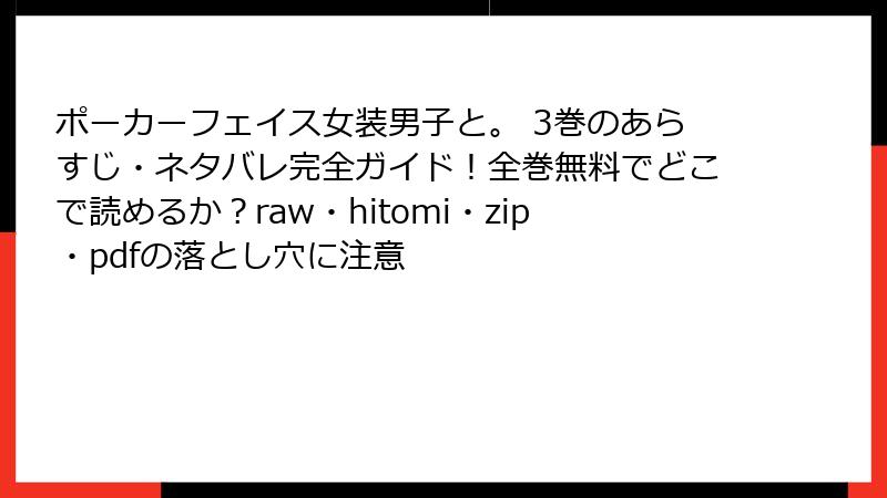 人気BL漫画『ポーカーフェイス女装男子と。』の3巻を、raw、hitomi、zip、pdf、漫画バンクなどの海賊版サイトで無料で読もうと考えている人もいるかもしれません。しかし、そんな手軽さの裏には深刻なリスクが潜んでいます。この記事では、法的・セキュリティ面から倫理的側面まで、詳しく解説。ブログ風に読み進めやすいようまとめましたので、ぜひ最後まで目を通してください。海賊版利用は一時的な便利さ以上の損失を生む可能性が高いですよ。