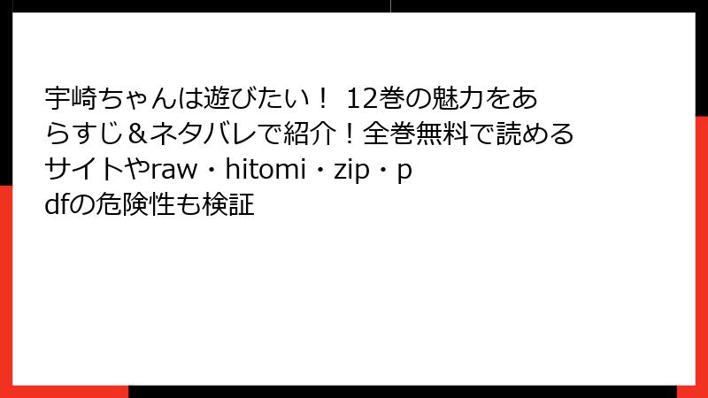 人気ラブコメ漫画『宇崎ちゃんは遊びたい!』の12巻を、raw、hitomi、zip、pdf、漫画バンクなどの海賊版サイトで読もうと考えている人もいるかもしれません。しかし、これらのサイトを利用することは、さまざまな深刻なリスクを伴います。この記事では、海賊版サイトの利用がもたらす法的、セキュリティ、経済的、倫理的な問題を詳しく解説します。無料で手軽にアクセスできるように見えても、結果として自分自身や周囲に大きな損害を与える可能性があることを理解しましょう。海賊版はクリエイターの権利を侵害し、業界全体に悪影響を及ぼすため、絶対に避けるべき選択です。