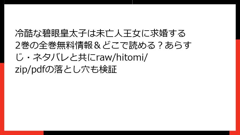 raw、hitomi、zip、pdf、漫画バンクなどの海賊版サイトで『冷酷な碧眼皇太子は未亡人王女に求婚する』を読むのは、法的・セキュリティ的な地雷原です。一瞬の無料の魅力に惑わされず、自身の安全と業界の未来を考えてください。万一被害に遭ったら、専門家に相談するなど早めの対処を。