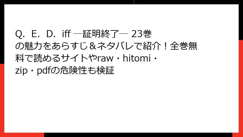 加藤元浩の人気ミステリ漫画『Q.E.D. iff ―証明終了―』(全30巻完結)は、前作『Q.E.D.証明終了』の続編として、燈馬想と水原可奈のコンビが活躍する知的エンターテイメント作品です。電子書籍版は多くのプラットフォームで配信されており、購入やレンタル、試し読みが可能です。以下では、ユーザーの質問で挙げられた主なサービス(コミックシーモア、BookLive、まんが王国、ebookjapan、Renta!、めちゃコミック、ピッコマ、LINEマンガ)を中心に、2025年12月現在の配信状況を詳しくまとめます。その他主要ストアの情報も参考に追加しています。