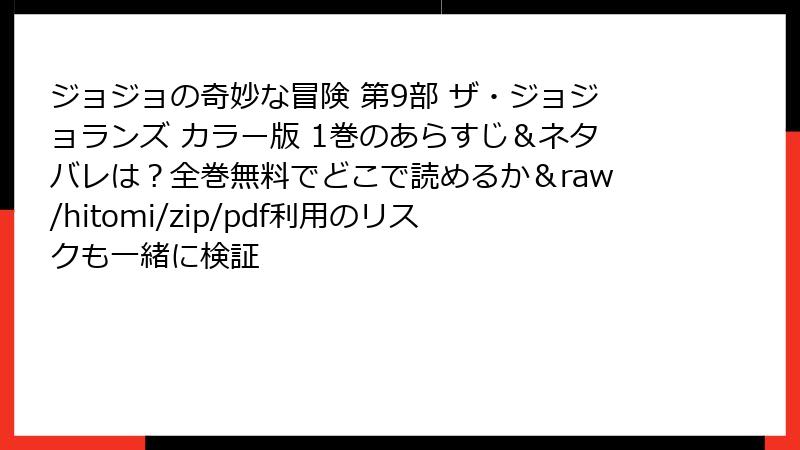 人気漫画『ジョジョの奇妙な冒険 第9部 ザ・ジョジョランズ』カラー版1巻を、raw、hitomi、zip、pdf、漫画バンクなどの海賊版サイトで読むのは一見手軽ですが、深刻なリスクを伴います。これらのサイトは著作権を無視した違法アップロードを基盤としており、利用者は知らず知らずのうちに犯罪に加担する可能性があります。本記事では、法的、セキュリティ、個人情報、倫理的・経済的、品質面のリスクを詳しく解説します。海賊版利用は一時的な便利さの代償として大きな問題を引き起こすことを理解しましょう。