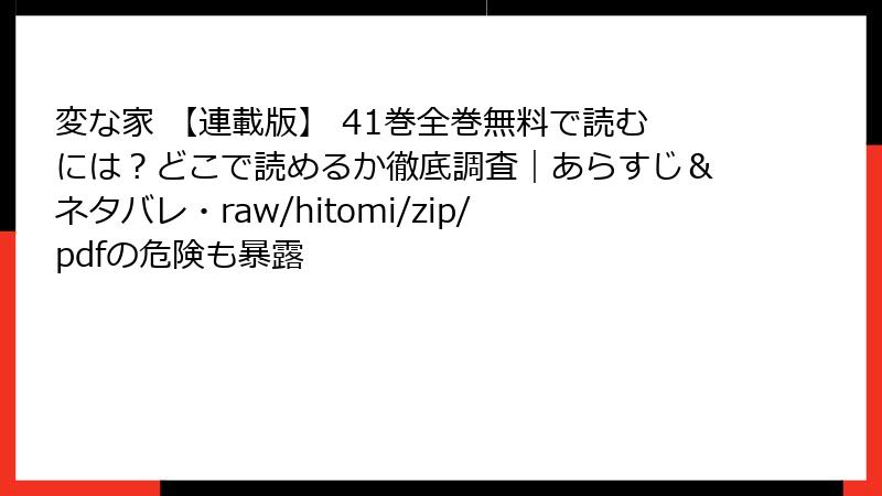 人気ホラーミステリー漫画「変な家 【連載版】」を、raw、hitomi、zip、pdf、漫画バンクなどの海賊版サイトで読むことは、一見無料で手軽に思えるかもしれません。しかし、これらのサイトを利用する行為は深刻なリスクを伴います。この記事では、法的・セキュリティ・プライバシーなどの観点から、詳しく解説します。海賊版サイトの利用は避け、正規のプラットフォームで楽しむことを強くおすすめします。