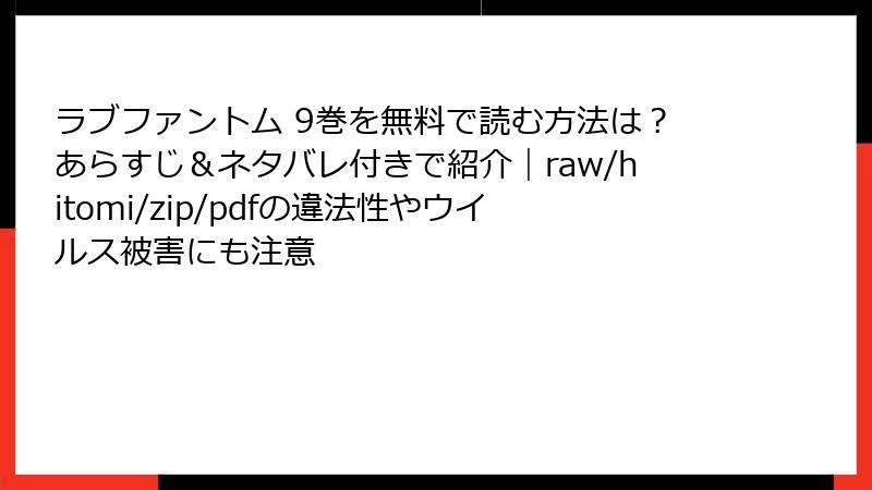人気漫画「ラブファントム」の9巻を、raw、hitomi、zip、pdf、漫画バンクなどの海賊版サイトで読もうとする人は少なくありません。しかし、これらのサイトを利用することは、さまざまな深刻なリスクを伴います。この記事では、法的側面からセキュリティ、経済的影響までを詳しく解説します。海賊版サイトの利用は一時的な便利さを提供するかもしれませんが、長期的には自分自身や業界全体に悪影響を及ぼす可能性が高いです。以下で、各リスクを深掘りしていきます。