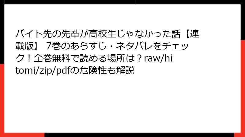 この記事では、漫画「バイト先の先輩が高校生じゃなかった話」の連載版7巻を、raw、hitomi、zip、pdf、漫画バンクなどの海賊版サイトで読むことのリスクを詳しく解説します。これらのサイトは一見無料で便利に見えますが、深刻な問題を引き起こす可能性があります。法的・セキュリティ面を中心に、具体的な危険性を掘り下げていきます。