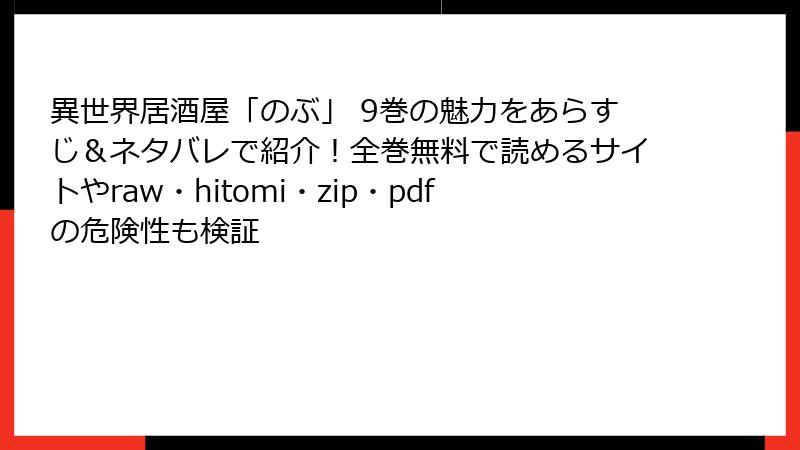 人気の異世界グルメ漫画『異世界居酒屋「のぶ」』を、raw、hitomi、zip、pdf、漫画バンクなどの海賊版サイトで読むのは、手軽に思えるかもしれません。しかし、これらのサイトを利用する行為には、さまざまな深刻なリスクが伴います。ここでは、法的側面からセキュリティ、品質、倫理的な問題までを詳しく解説します。海賊版サイトの利用は、短期的には便利でも、長期的には自分自身や業界全体に悪影響を及ぼす可能性が高いのです。
