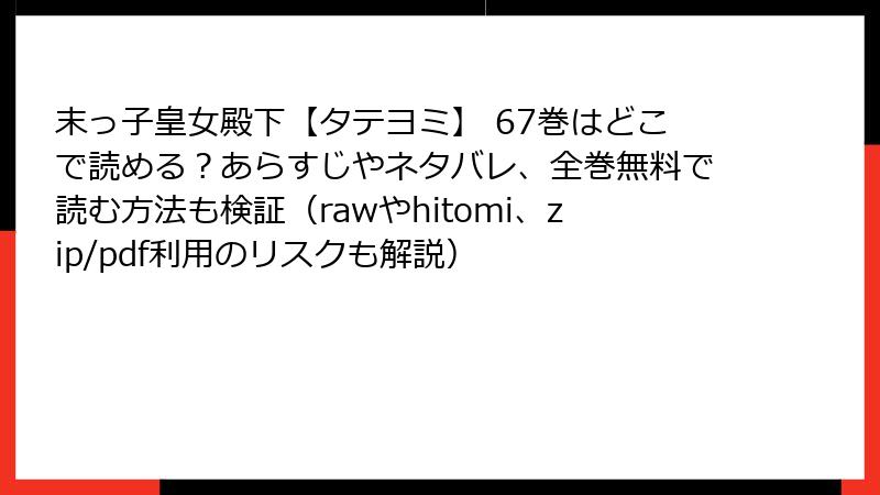 人気のファンタジー漫画「末っ子皇女殿下【タテヨミ】」を楽しむ方法として、海賊版サイト(raw、hitomi、zip、pdf、漫画バンクなど)が挙げられることがありますが、これらを利用することはさまざまなリスクを伴います。この記事では、そうした海賊版サイトで漫画を読むことの危険性を詳しく解説します。法的問題からセキュリティの脅威まで、読み応えのある形でまとめました。海賊版は一見便利ですが、長期的に見て損失が大きいことを理解しましょう。