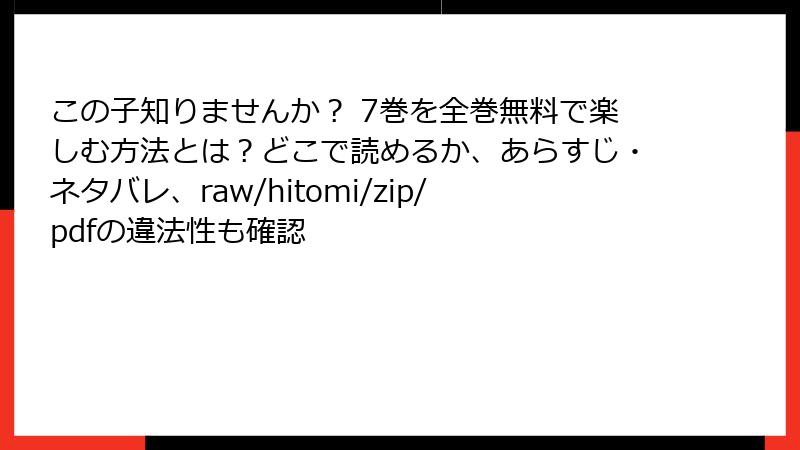 人気漫画『この子知りませんか?』を無料で楽しみたいという誘惑から、海賊版サイトを利用する人も少なくありません。しかし、raw、hitomi、zip、pdf、漫画バンクなどの違法サイトで読む行為には、深刻なリスクが伴います。この記事では、それらのリスクを法的、セキュリティ、プライバシー、倫理的な観点から詳しく解説します。海賊版サイトの利用は一見便利ですが、長期的に見て大きな損失を招く可能性が高いです。安全で合法的な方法を選ぶことを強くおすすめします。