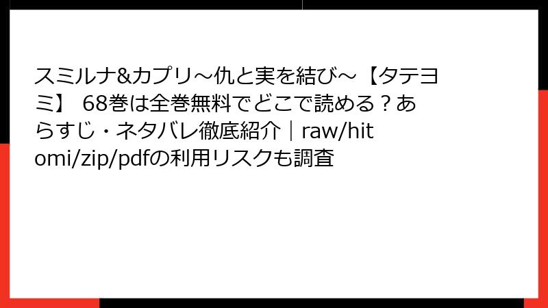 人気のタテヨミ漫画「スミルナ&カプリ~仇と実を結び~」の68巻を、raw、hitomi、zip、pdf、漫画バンクなどの海賊版サイトで読むのは便利に思えるかもしれません。しかし、これらのサイトを利用する行為には深刻なリスクが伴います。この記事では、法的側面からセキュリティ、倫理的問題までを詳しく解説します。海賊版は一時的な楽しみを提供するかもしれませんが、長期的に見て損失が大きいことを理解しましょう。読み進める前に、公式ルートでの購読をおすすめします。