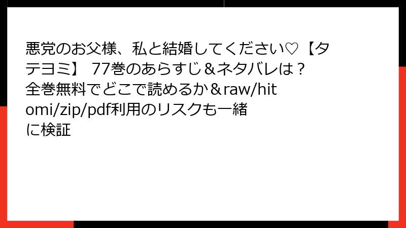 人気のロマンスファンタジー漫画『悪党のお父様、私と結婚してください♡』を、raw、hitomi、zip、pdf、漫画バンクなどの海賊版サイトで読むのは一見手軽ですが、深刻なリスクが伴います。この記事では、そんな違法サイト利用の危険性を詳しく解説します。法的問題からセキュリティの脅威まで、さまざまな角度から考察し、なぜ正規ルートを選ぶべきかを考えていきましょう。海賊版はクリエイターの権利を侵害する行為であり、長期的に見て業界全体に悪影響を及ぼします。