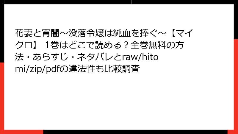 人気の漫画『花妻と宵闇~没落令嬢は純血を捧ぐ~【マイクロ】』を、raw、hitomi、zip、pdf、漫画バンクなどの海賊版サイトで無料で読もうとする人は少なくありません。しかし、これらのサイトを利用することは、さまざまな深刻なリスクを伴います。この記事では、海賊版サイトの利用がもたらす法的、セキュリティ、プライバシー、倫理的な問題を詳しく解説します。無料の誘惑に負けず、正規の手段で楽しむ重要性を理解しましょう。