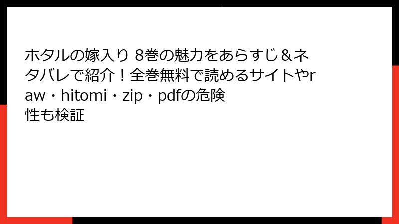 人気漫画『ホタルの嫁入り』を、raw、hitomi、zip、pdf、漫画バンクなどの海賊版サイトで読むのは、手軽に思えるかもしれません。しかし、これらのサイトを利用する行為には深刻なリスクが伴います。この記事では、そんな海賊版サイトの利用リスクを多角的に解説します。法的問題からセキュリティの脅威、さらには業界全体への影響まで、詳しく掘り下げます。海賊版の利用を検討している方は、ぜひこの内容を参考に、正規ルートでの楽しみにシフトすることをおすすめします。