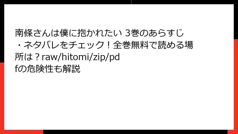 人気漫画「南條さんは僕に抱かれたい」の3巻を、raw、hitomi、zip、pdf、漫画バンクなどの海賊版サイトで読むのは手軽に思えるかもしれません。しかし、これらのサイトを利用することは深刻なリスクを伴います。この記事では、そんな海賊版サイトの危険性を詳しく解説します。法的問題からセキュリティ面、さらには経済的・倫理的な側面まで、複数の角度から掘り下げてみましょう。海賊版を利用する前に、ぜひこの情報を参考にしてください。