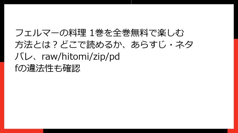 これらのリスクを避けるには、正規のプラットフォームで作品を楽しむのがベストです。海賊版の誘惑に負けず、法的・安全な方法を選べば、安心して「フェルマーの料理」を満喫できます。リスクを理解し、賢い選択を心がけましょう。