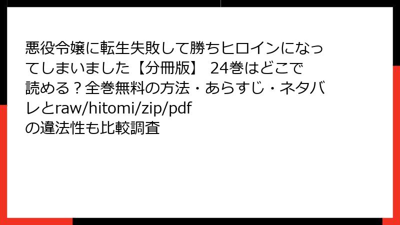 『悪役令嬢に転生失敗して勝ちヒロインになってしまいました【分冊版】』の24巻は、異世界転生ファンタジーの人気作として多くの電子書籍サービスで配信されています。この記事では、コミックシーモア、ブックライブ、まんが王国、ebookjapan、Renta!、めちゃコミック、ピッコマ、LINEマンガを中心に、配信の有無や特徴を詳しく解説します。2025年12月28日現在の情報に基づき、電子書籍の利便性を考慮した視点でまとめています。配信状況は変動する可能性があるため、最新情報を確認することをおすすめします。