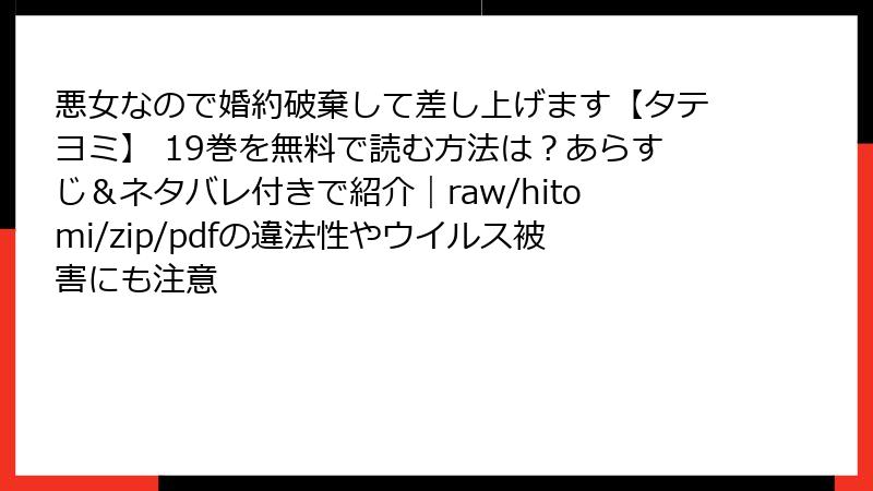 「悪女なので婚約破棄して差し上げます【タテヨミ】」のような魅力的な作品を海賊版サイトで読むのは、法的・セキュリティ・経済的リスクが伴う危険な選択です。これらのリスクを避けるため、公式チャネルを検討することをおすすめします。最終的に、海賊版の利用は自分自身と業界に悪影響を及ぼすことを念頭に置いてください。
