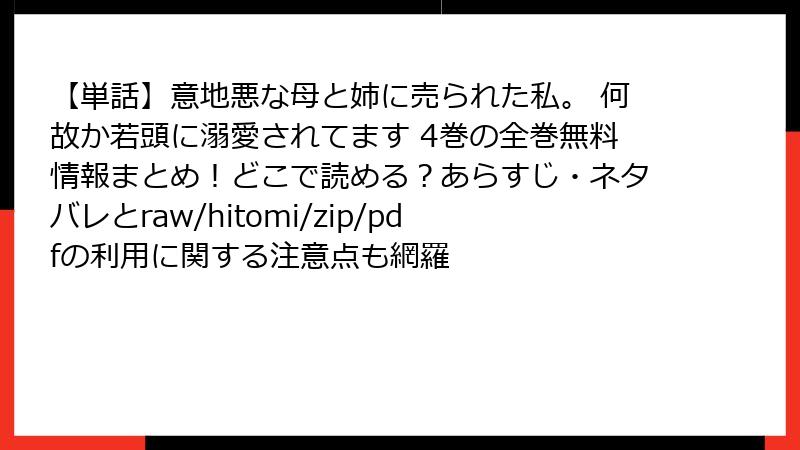 この記事では、人気コミック「意地悪な母と姉に売られた私。 何故か若頭に溺愛されてます」の第4巻のあらすじを詳しく解説します。シリーズのファン必見の展開を、ネタバレを含めて深掘りしていきます。家族の裏切りから始まるヒロインの運命が、ヤクザの世界でどのように変化していくのかを追っていきましょう。