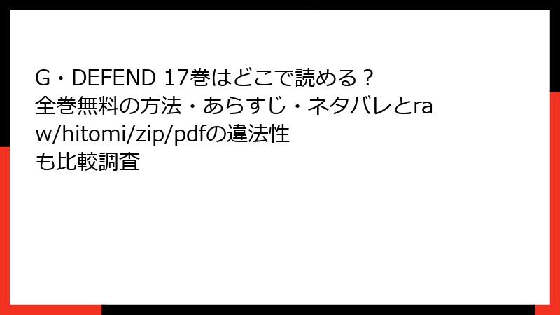 「G・DEFEND 17巻」は、指定のサービスのうち7つで読め、選択肢が豊富です。まずは無料試し読みから始め、好みのプラットフォームで全巻集めるのがおすすめ。シリーズファンなら、配信状況を確認して一括購入を検討してみてください。これで快適な読書ライフを楽しめます。