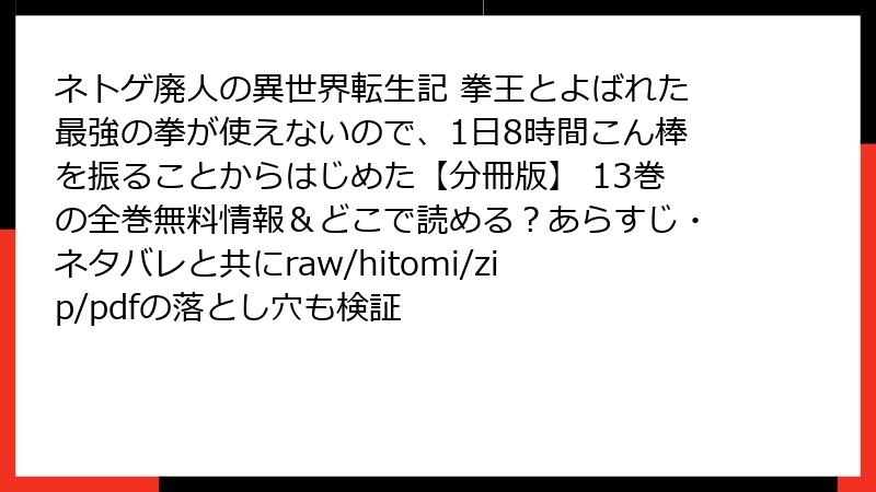 ネトゲ廃人の異世界転生記 拳王とよばれた最強の拳が使えないので、1日8時間こん棒を振ることからはじめた【分冊版】 13巻の全巻無料情報&どこで読める?あらすじ・ネタバレと共にraw/hitomi/zip/pdfの落とし穴も検証