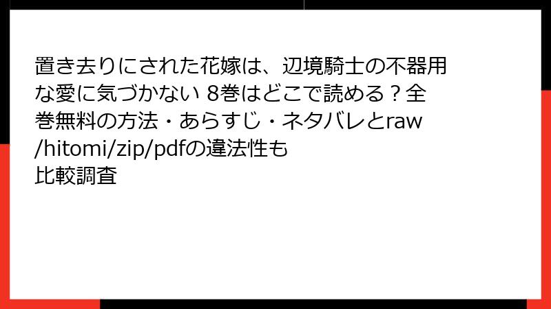 置き去りにされた花嫁は、辺境騎士の不器用な愛に気づかない 8巻はどこで読める?全巻無料の方法・あらすじ・ネタバレとraw/hitomi/zip/pdfの違法性も比較調査 少女マンガ X Facebook はてブ Pocket LINE コピー 2026.01.04